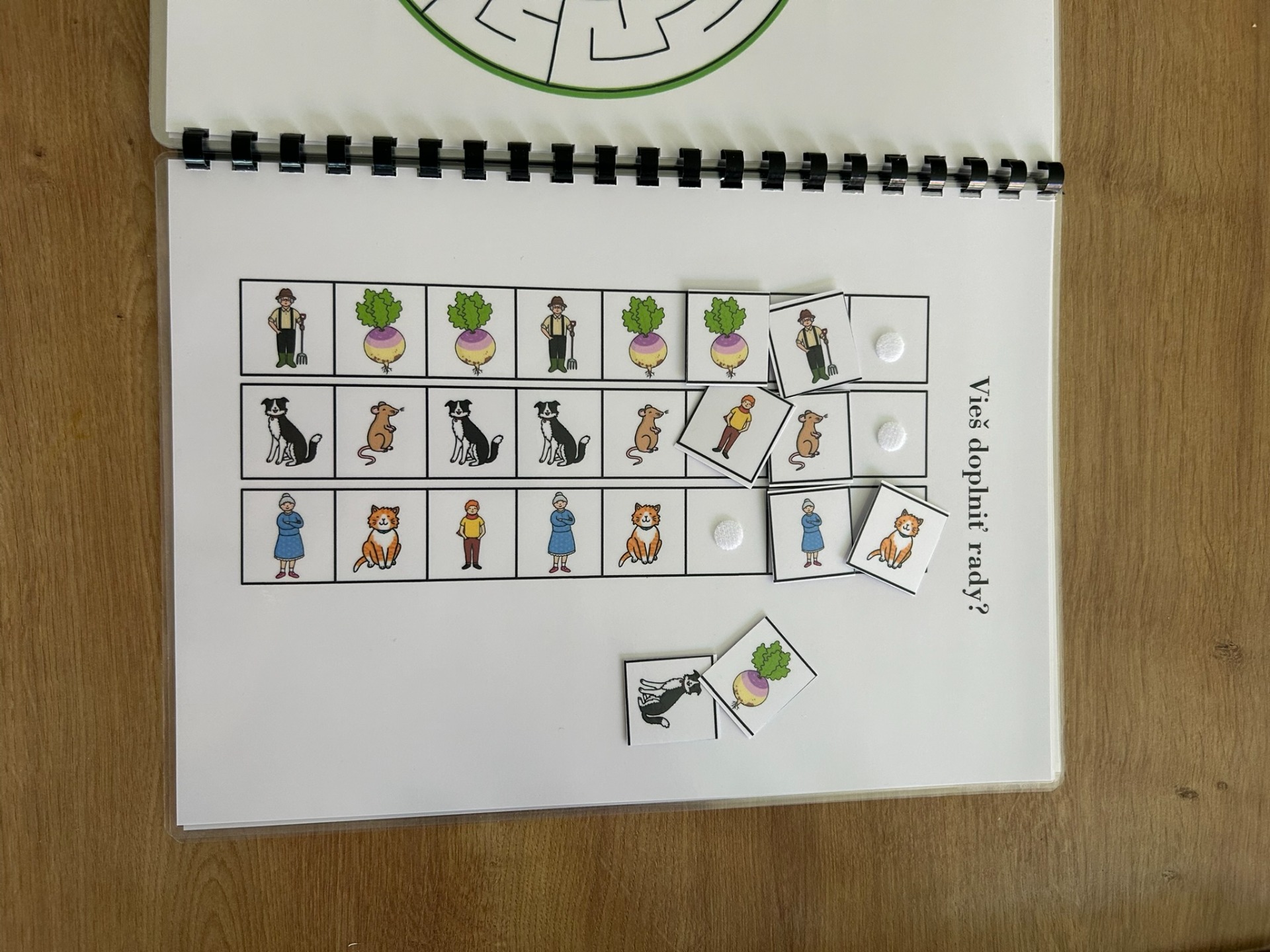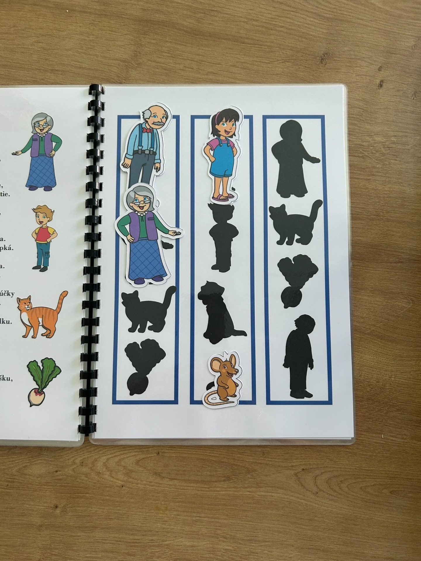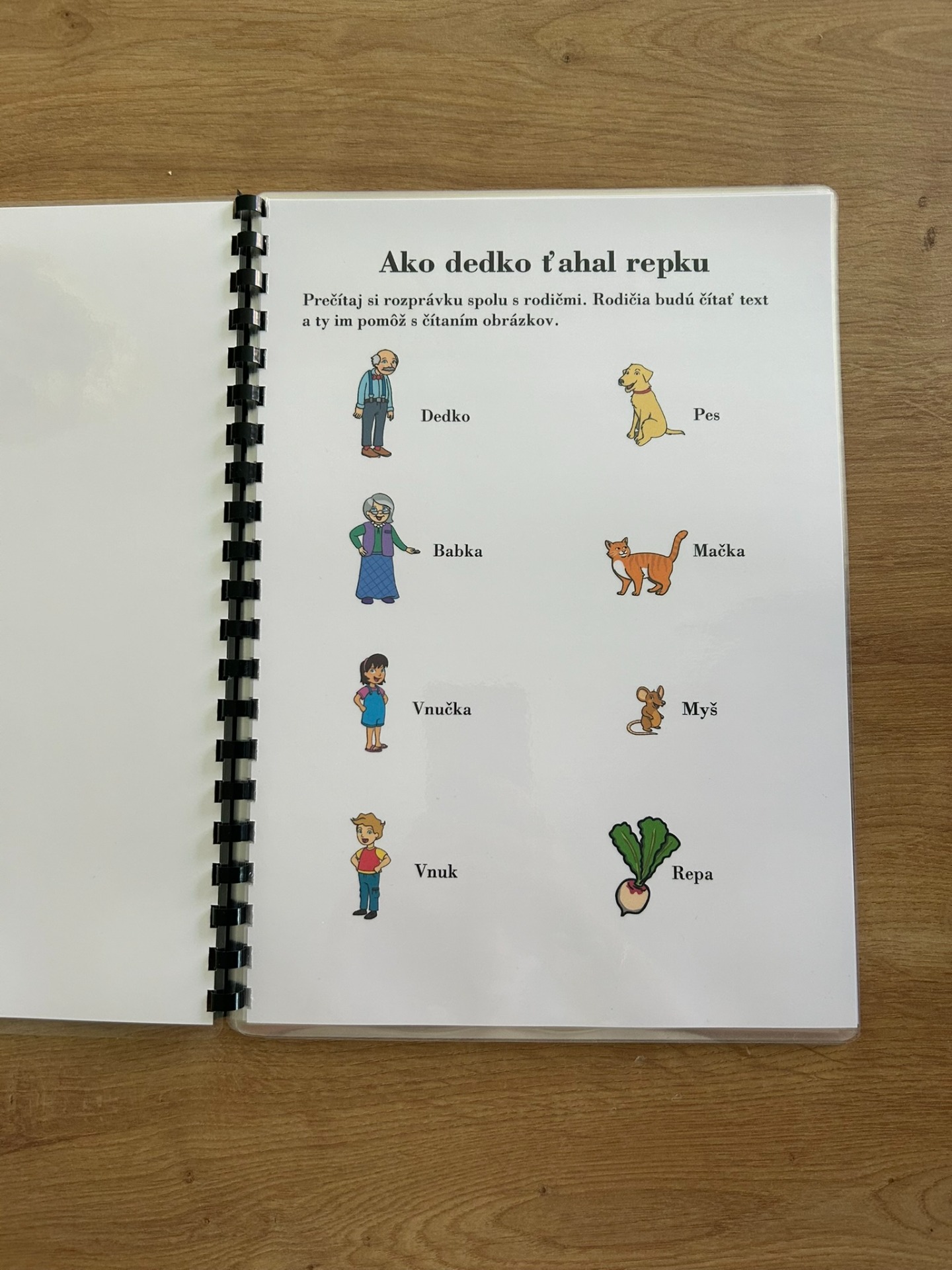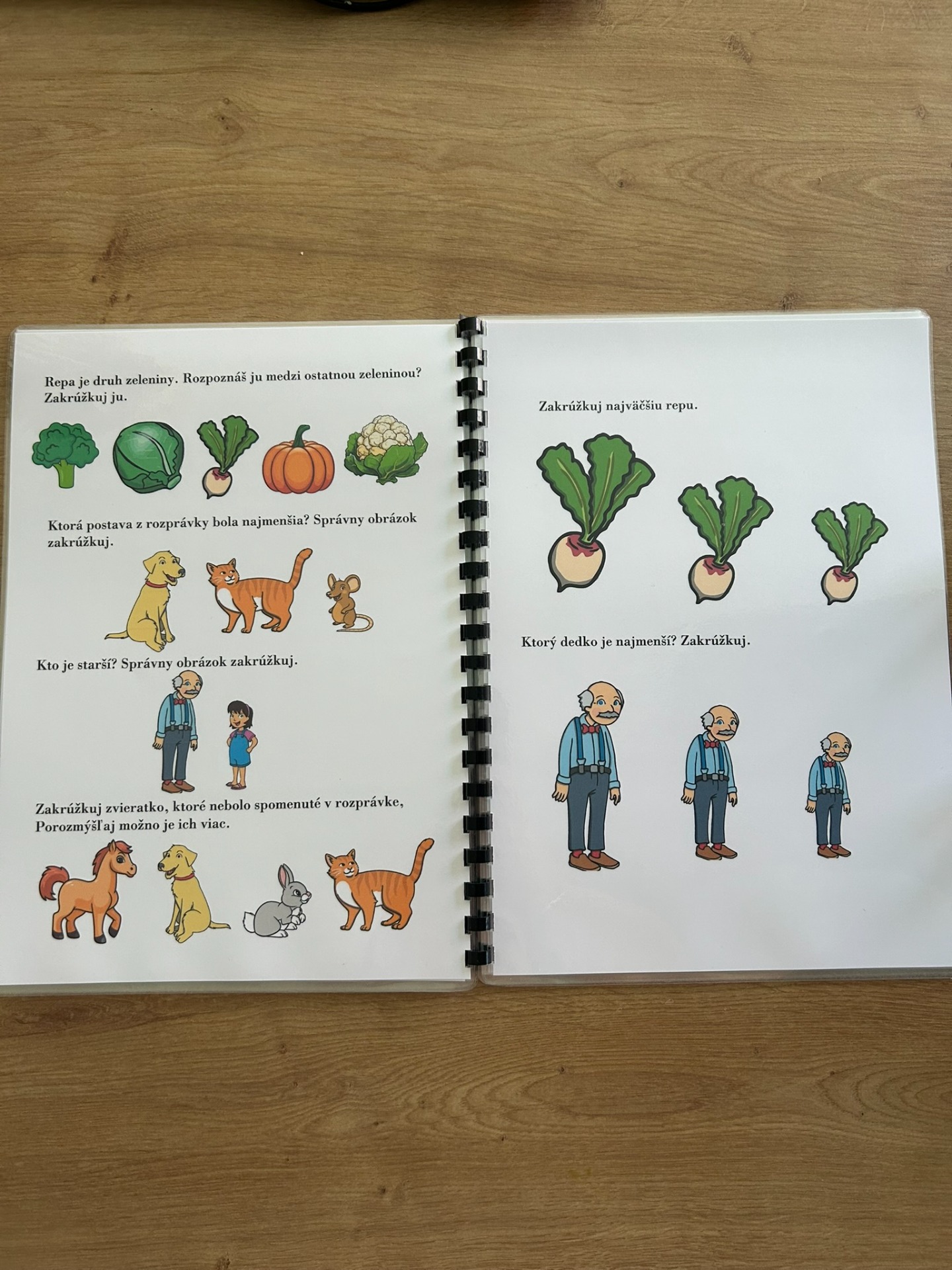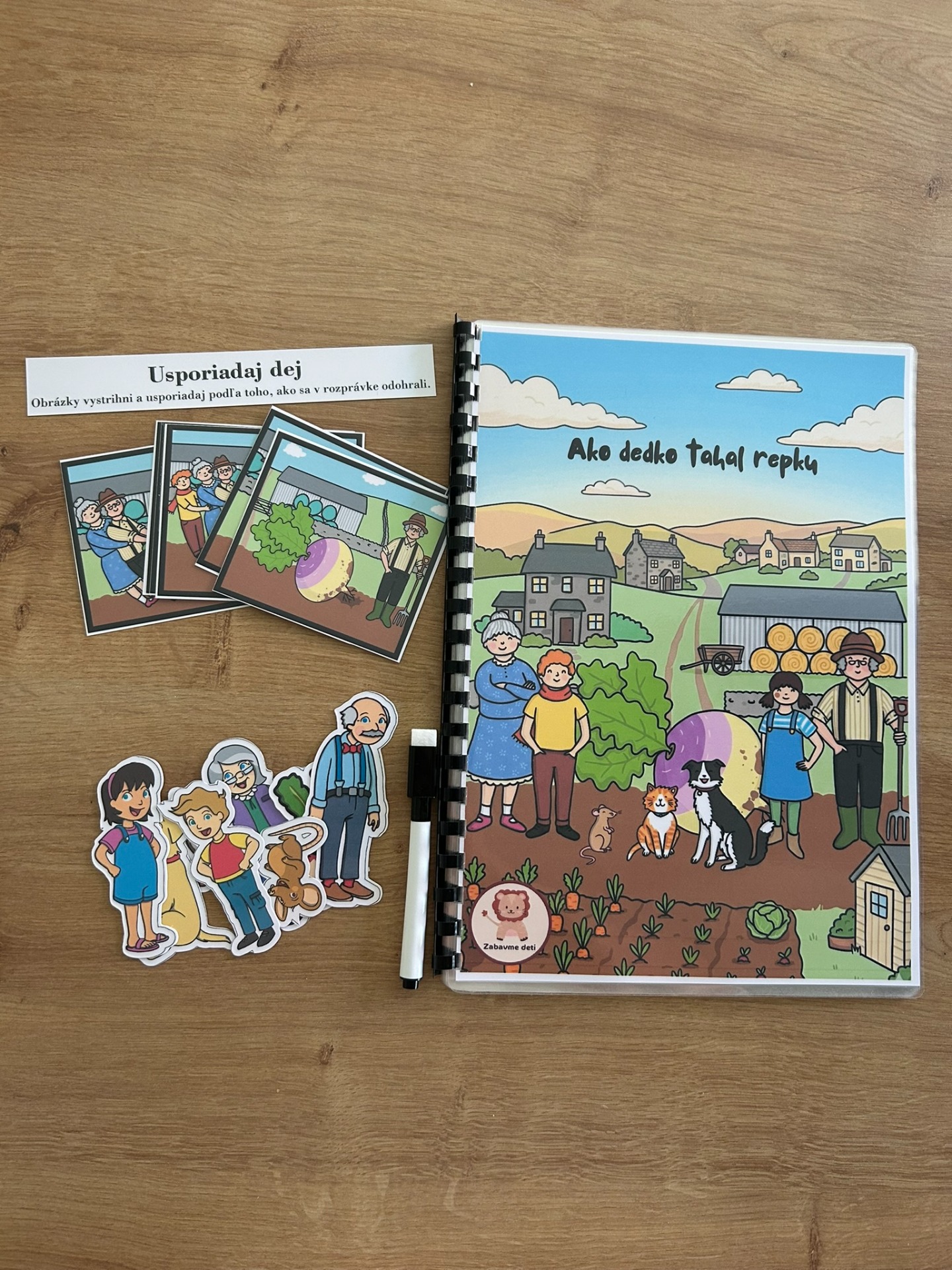 Knižka ako dedko ťahal repku obsahuje rozprávku kde detičky podľa obrázkov doplňaju dej. Obsahuje tiež hádanky , trénovanie grafomotoriky, priraďovanie postavičiek k tieňu a ďaľšie ...