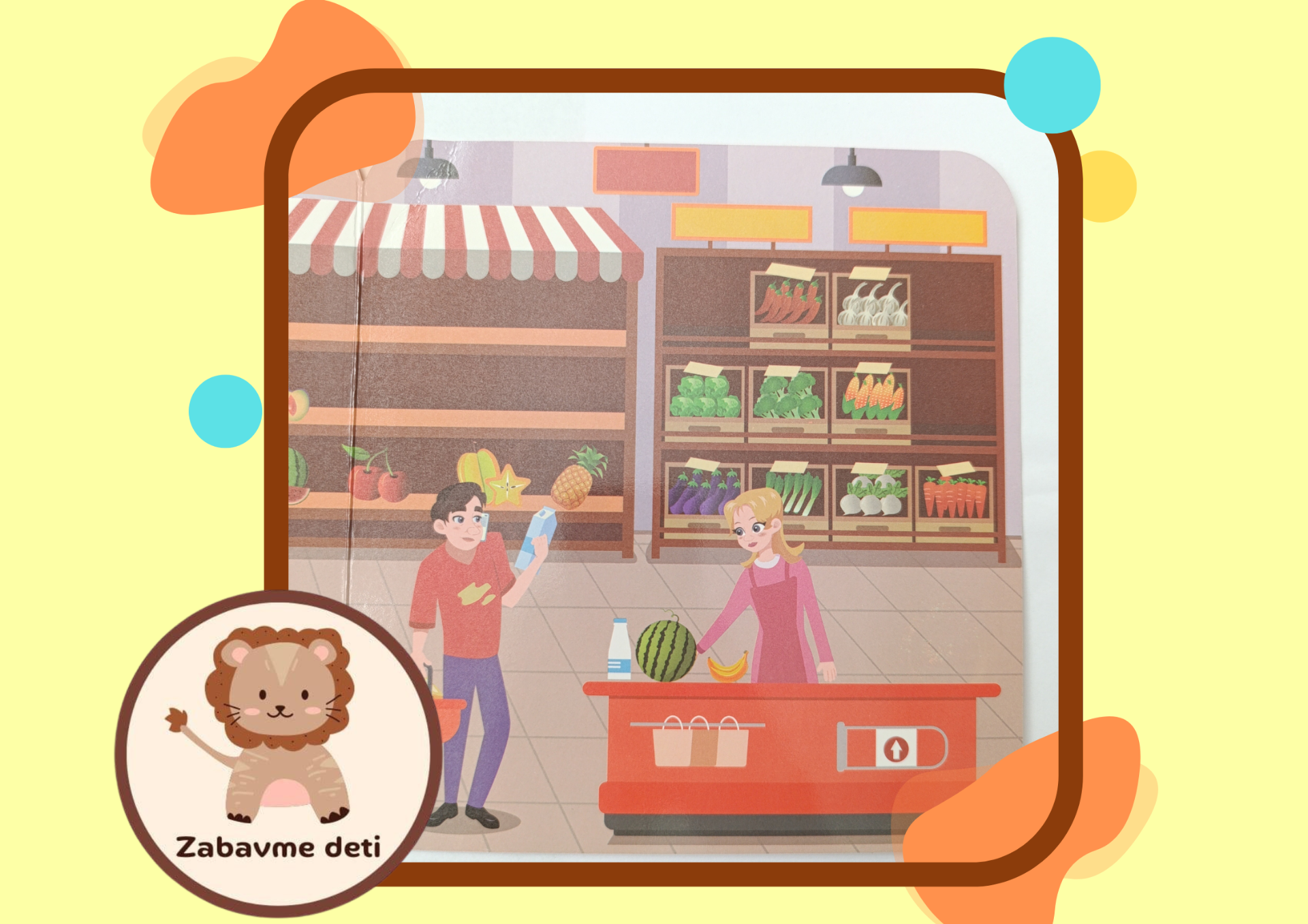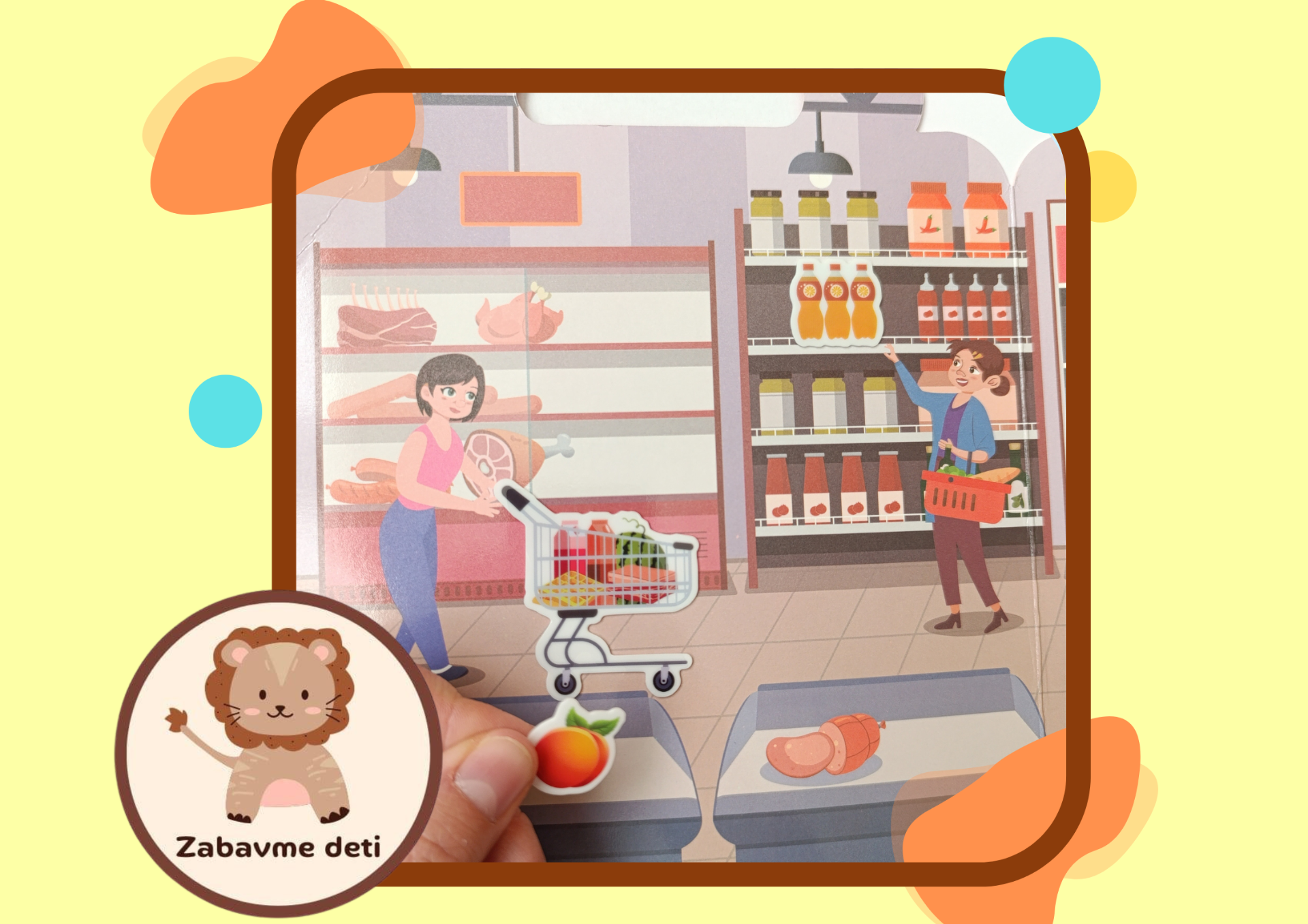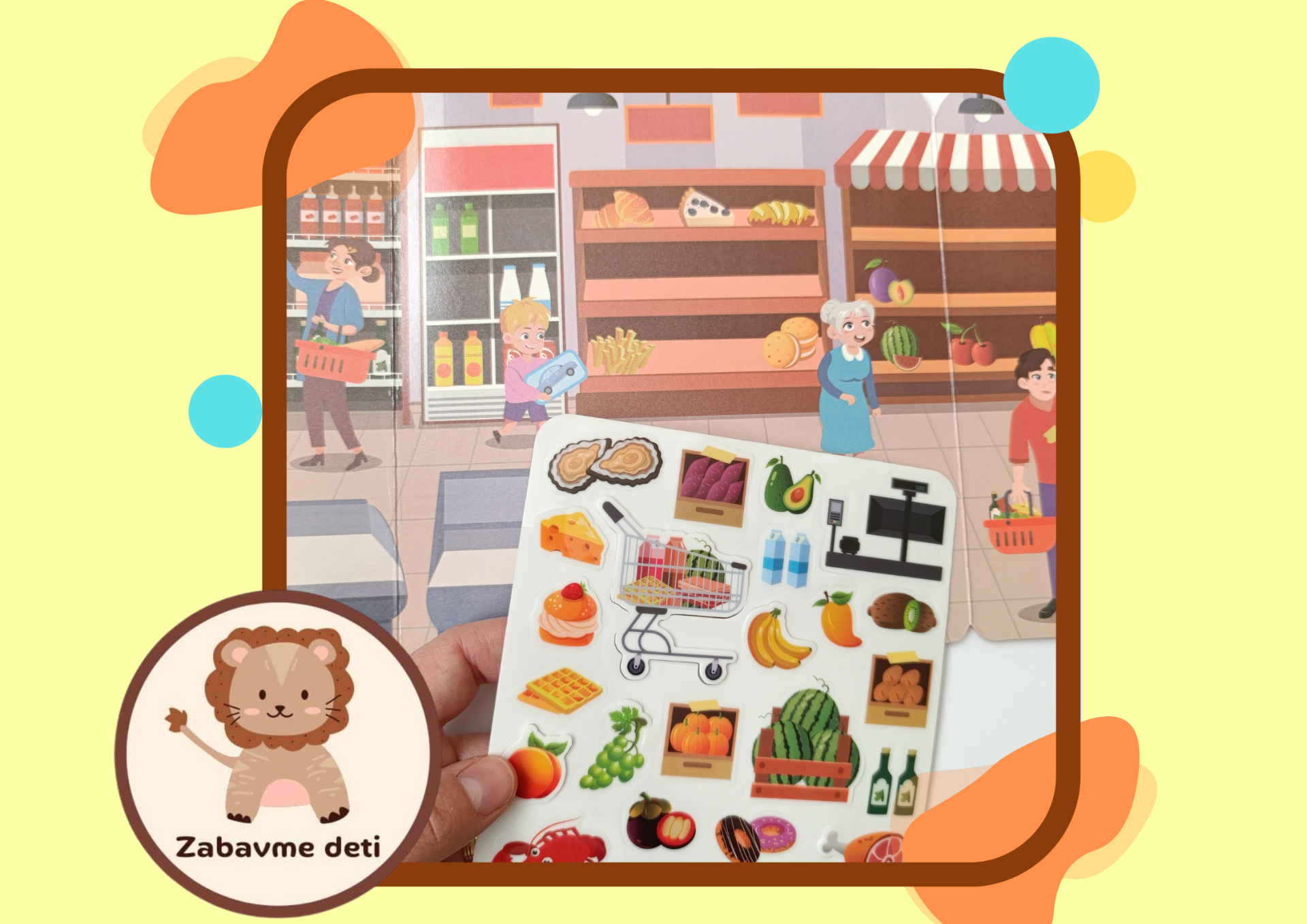 Knižka Supermarket umožňujem deťom pomocou gumových samolepiek vytvárať vlastné príbehy o nakupovaní. Vhodné už pre deti od 1.5 roka.