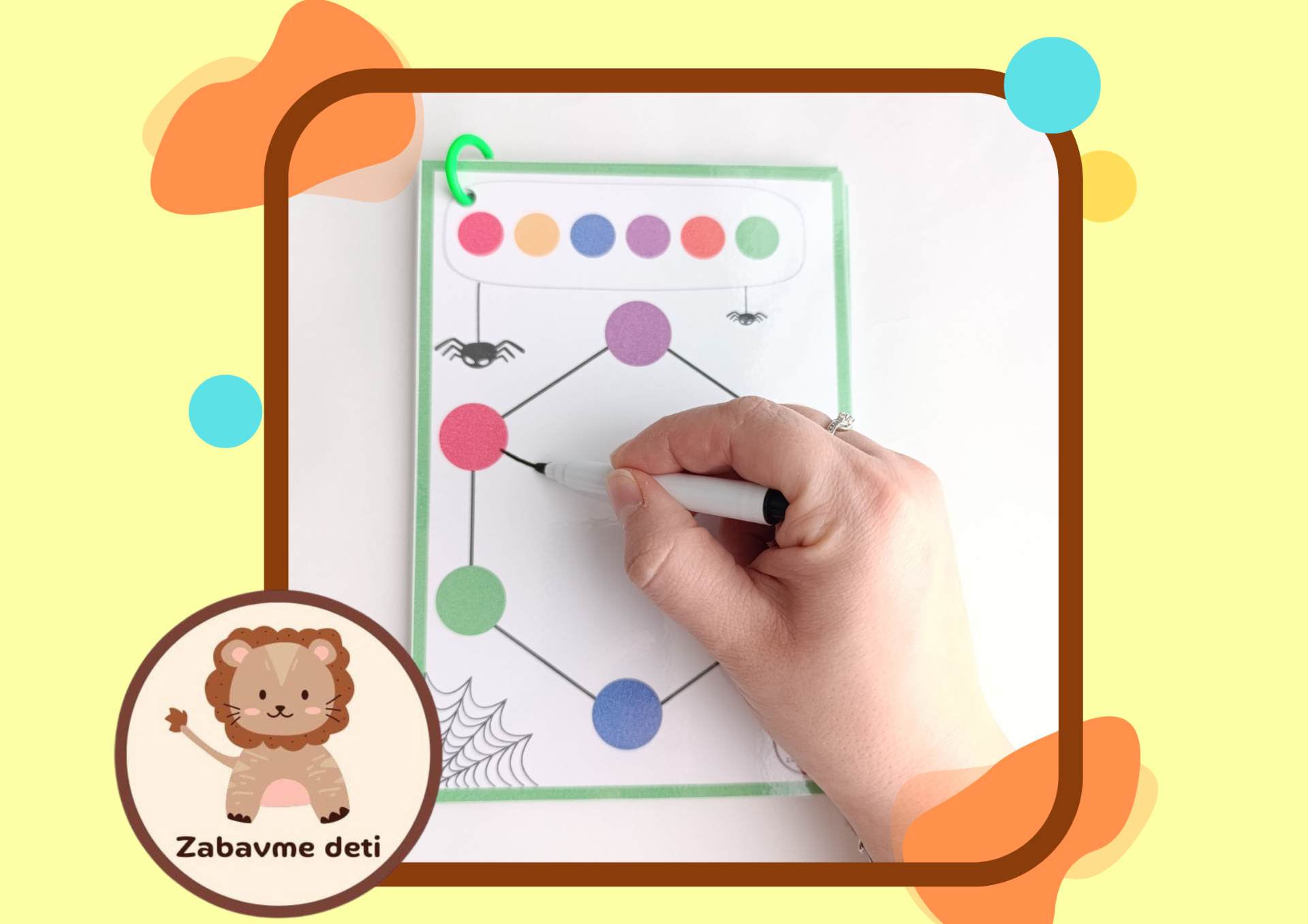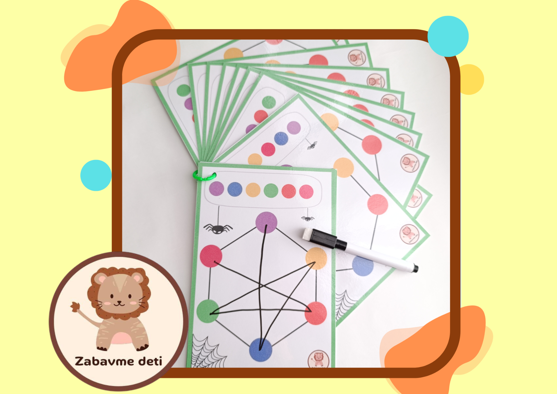 Pavúčia sieť je hra pri ktorej dieťa spája farebné body a vytvára pavúčiu sieť. Precvičuje si tak jemnú motoriku, pozornosť, sústredenie, logické myslenie a koordináciu oko a ruka. Súčasťou hry je aj zmazateľná fixka. Formát hry - A5, je to ideálna hra na doma alebo na dlhé cesty autom.