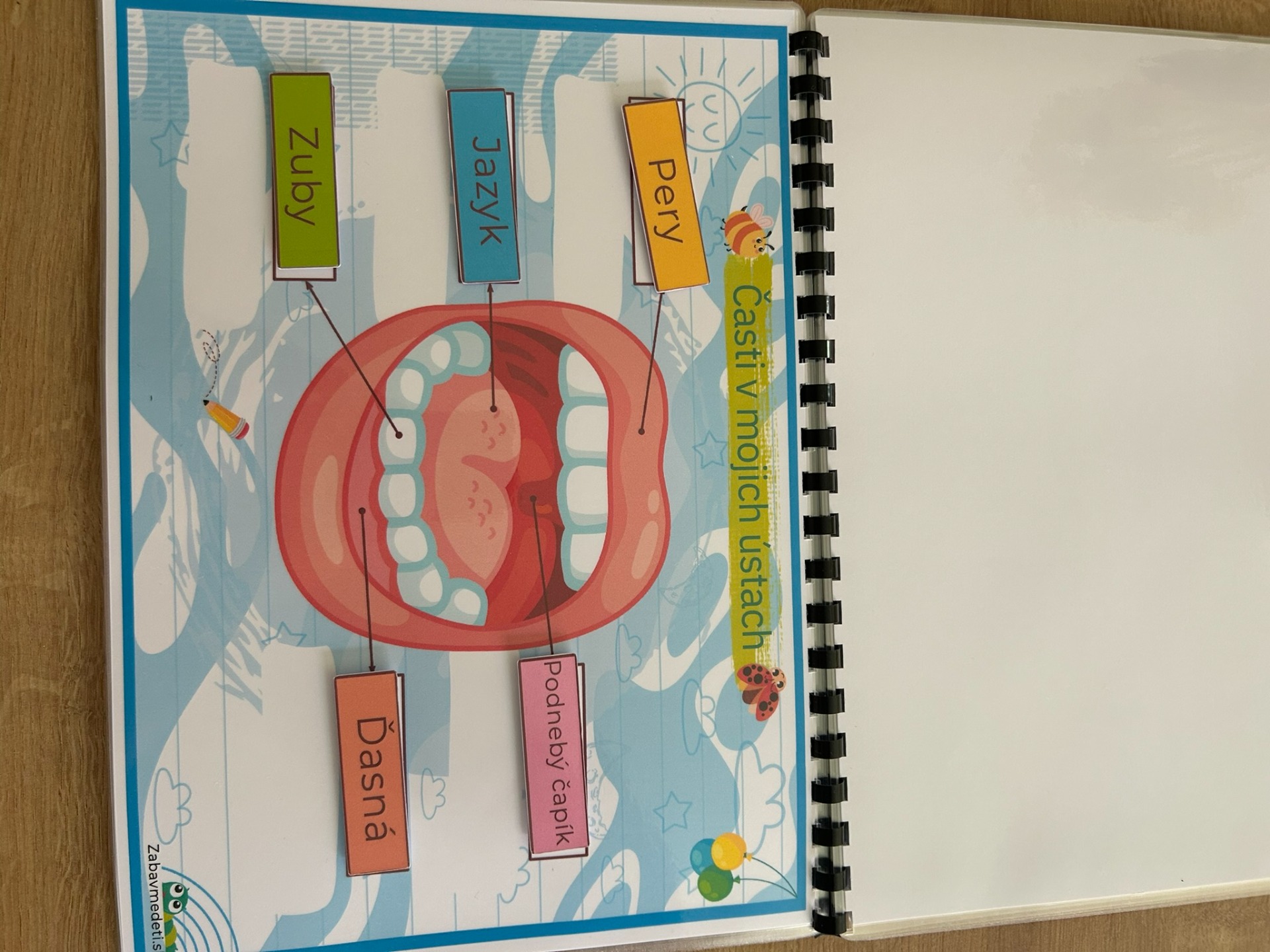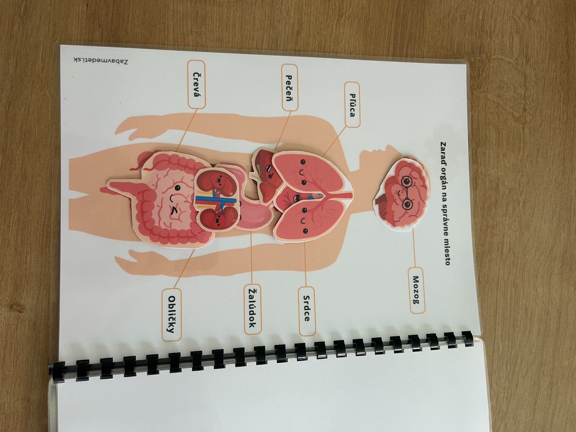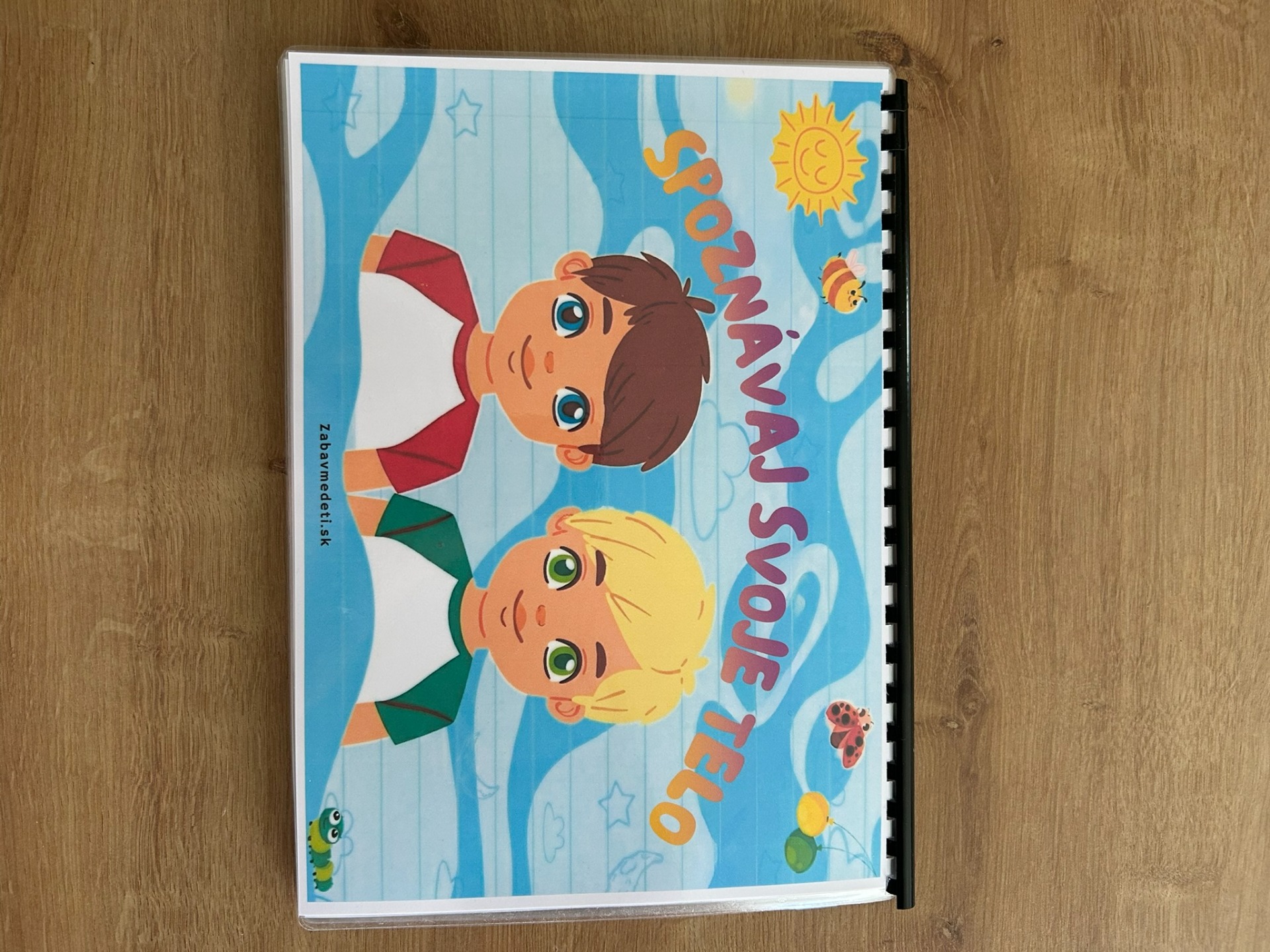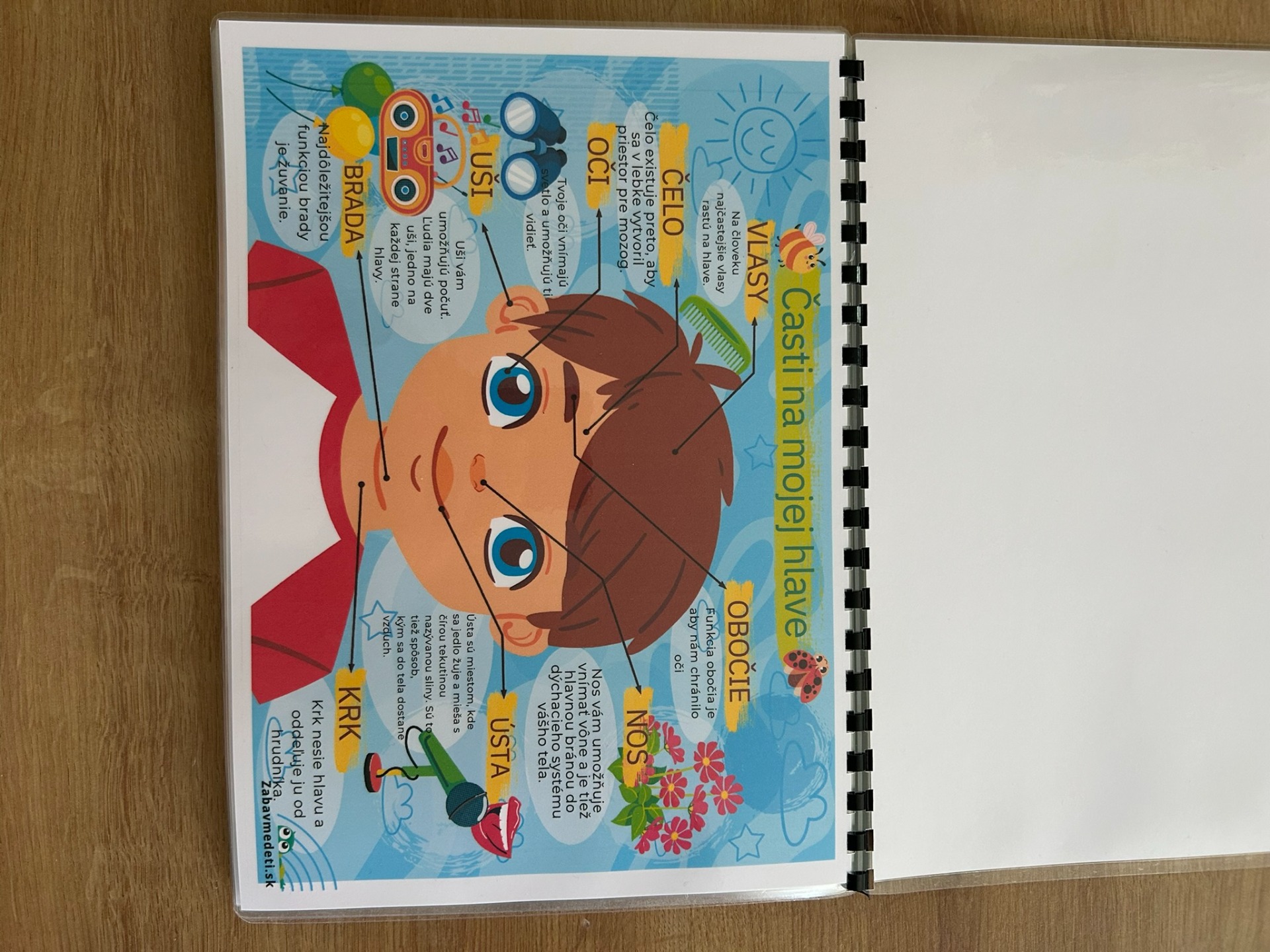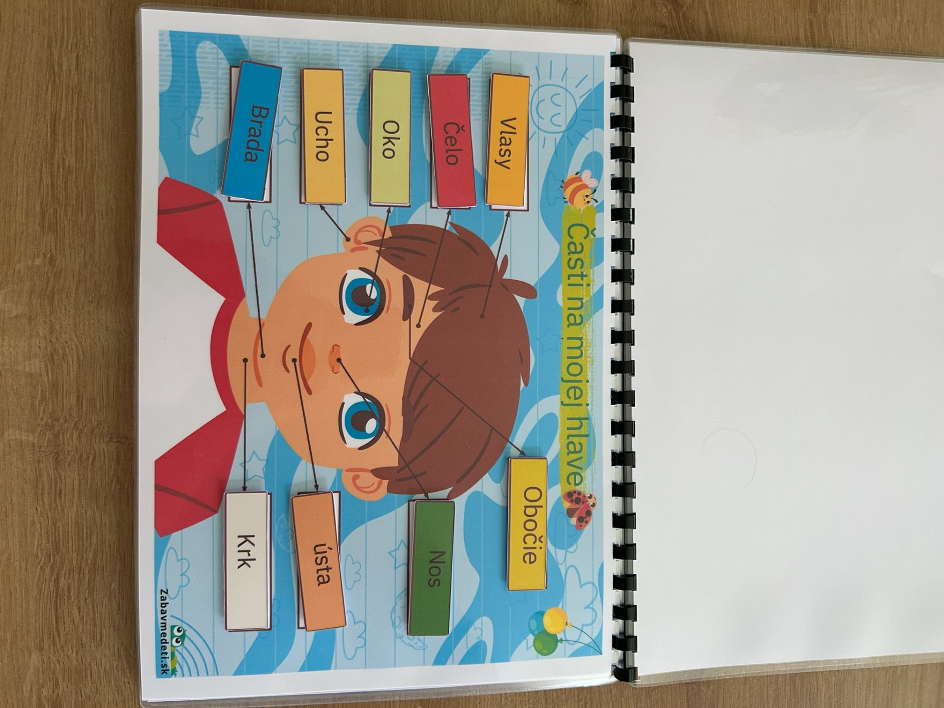 Knižka spoznávaj telo učí deti hravým sposobom čo všetko máme na svojom tele. Deti možu suchým zipsom priraďovať veci na správne miesto.