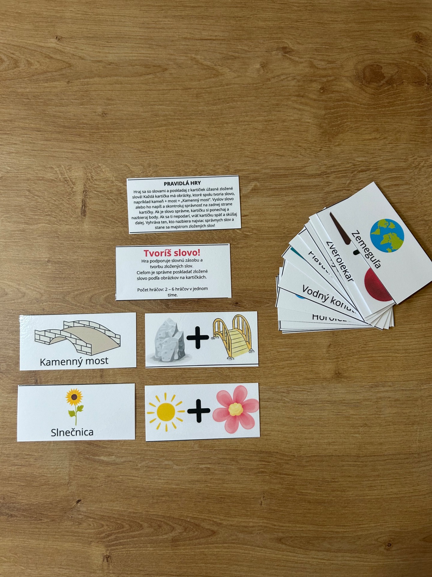 Hraj sa zo slovami a poskladaj podľa kartičiek slovo. Každá kartička má obrázky ktoré spolu vytvoria slovo.
