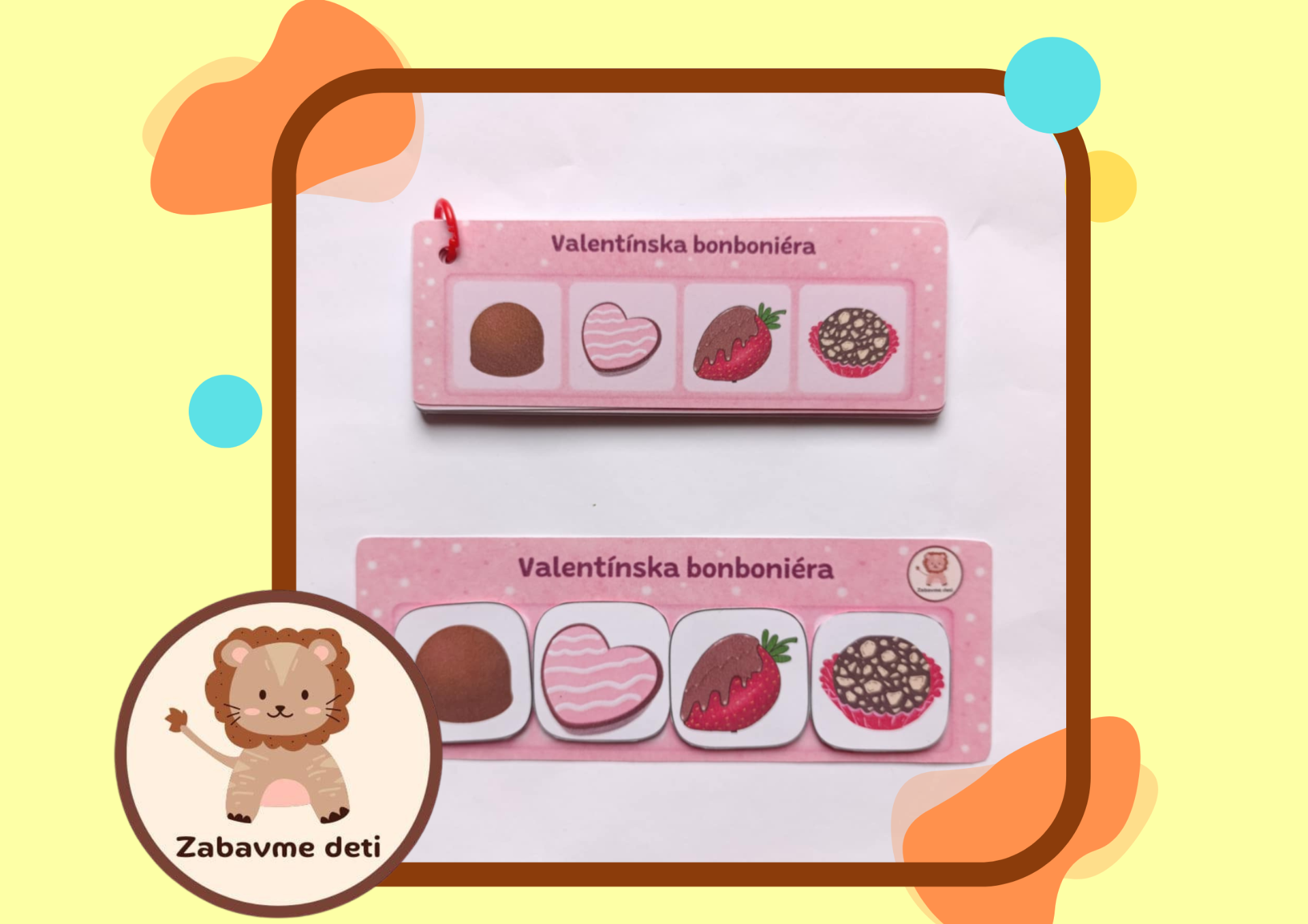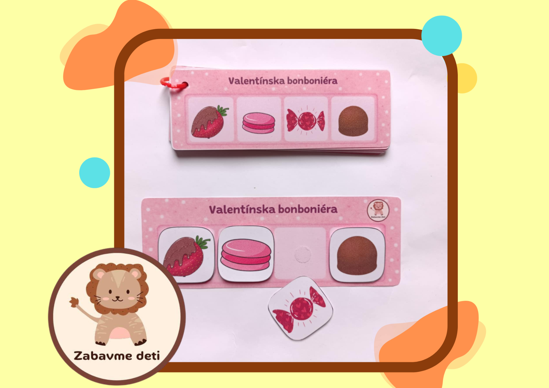 Hra Valentínska bonboniéra je hra vhodná už pre deti od 3 rokov, v ktorej deti ukladajú ,,sladké" kúsky do bonboniéry podľa predlohy. Hravou formou rozvíjajú jemnú motoriku, zrakové vnímanie, logické myslenie a sústredenie.